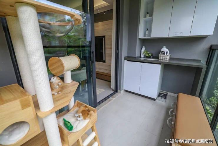 约1.8米进深阳台,预留开阔家政柜位置,满足机洗、手洗、收纳功能,省心更舒心。