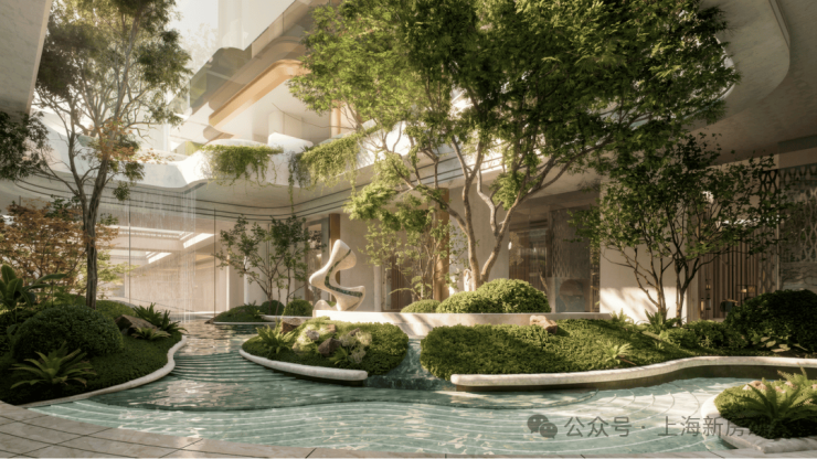 该项目规划的 核心下沉庭院,以黄浦江为灵感 ,将江水流动的波纹形态、动态色彩与滩涂肌理转化为空间语言,通过水景、地形起伏与植物层次的组合,营造富有节奏感的花园场景。