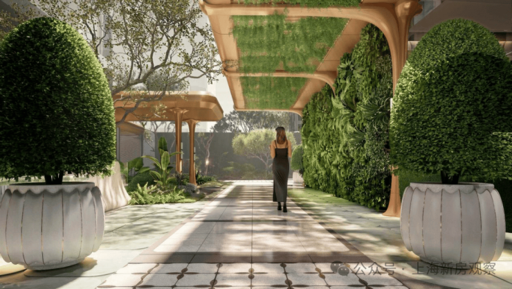 社区将通过入口大门、风雨连廊与架空层灰空间,形成层层递进的景观序列。光影透过廊架洒落,与两侧绿意交织,归家动线在遮蔽与开放之间自然过渡,使行走成为一段富有节奏的花园漫步,形成沉浸式的私密庭园,让归家成为游园体验。