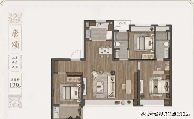 建面约 129㎡三室两厅两卫 :改善进阶之选,南向横厅设计,面宽约 6 米,客厅空间超 30㎡,大气开阔;三卧室朝南,均带飘窗,采光充足;主卧套房配独立卫浴与衣帽间,全屋收纳约 35㎡,满足家庭进阶需求。