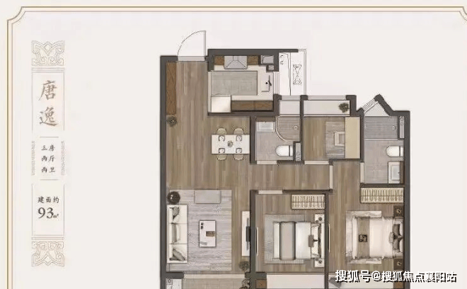 建面约 93㎡三室两厅两卫 :刚需入门首选,三开间朝南、南北通透,客餐厅一体化连通南向阳台,主卧套房带独立卫浴与飘窗,双卫设计避免早高峰拥堵,全屋收纳充足,总价约 210 万起,首付门槛友好。