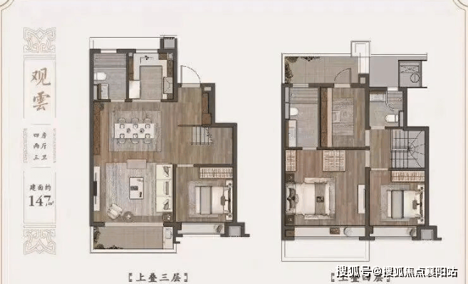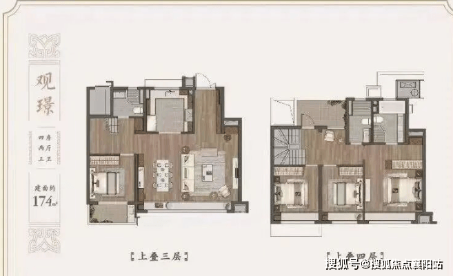 上叠(建面约 175-188㎡) :私梯直达入户,一层客餐厅一体化,面宽约 4.5 米,连通南向阳台,视野开阔;二层双卧朝南,主卧套房带独立卫浴与衣帽间;顶层赠约 20-40㎡星空露台,可布置观景台、烧烤区、阳光花房,俯瞰唐风园林与河景,享受 “有天有地” 的墅居生活。
