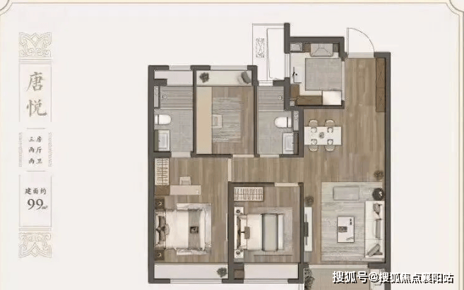 建面约 99㎡三室两厅两卫 :三口之家优选,户型方正、动静分区,南向面宽约 10 米,客厅面宽约 3.8 米,采光视野俱佳;主卧套房设计,私密性强;U 型厨房动线流畅,预留双开门冰箱位,居住体验优于同面积段产品。
