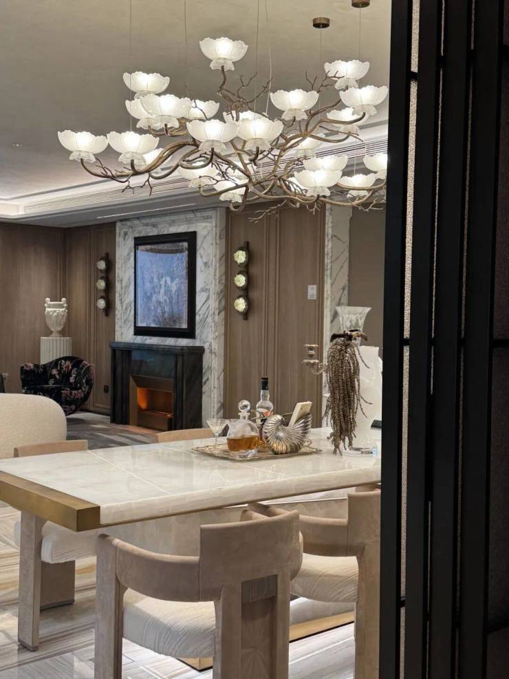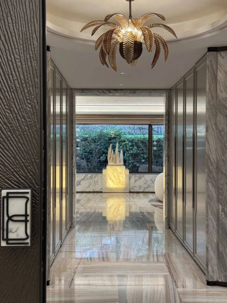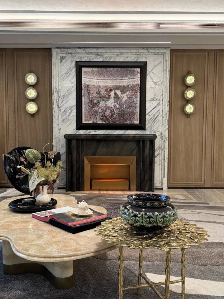 地面墙面 :客厅、餐厅采用天然石材铺地,卧室采用实木地板,环保健康、质感舒适;墙面采用高端墙布 + 艺术涂料,质感高级、历久弥新;背景墙采用天然石材 + 金属线条,彰显顶奢审美。