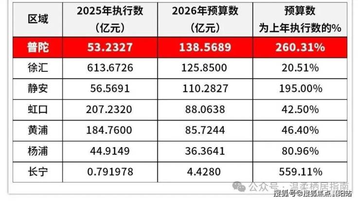 其次,2026年普陀拆迁与征地补偿预算高达约138亿,全市最高。