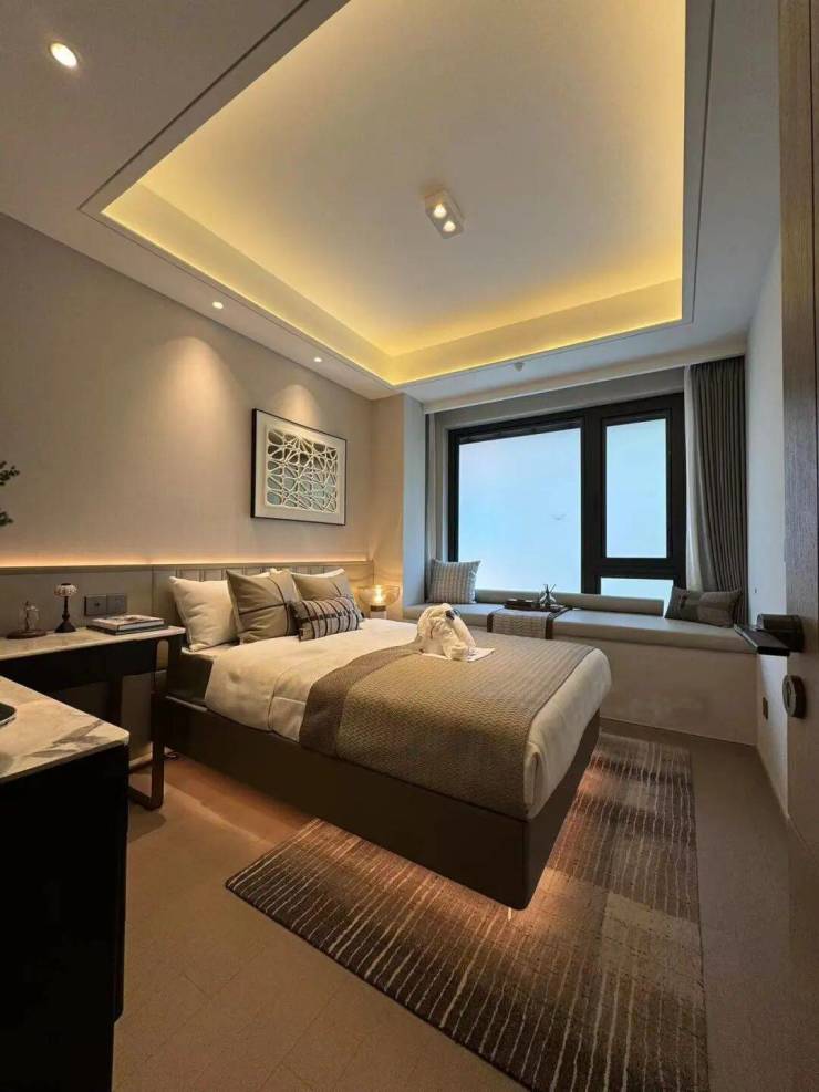 而人行线路则由星级酒店式的入户大堂进入,接着便是6S会所环绕的下沉式水景庭院,约7米高磅礴大气的水景墙配合乌桕林和原石、浮桥交错的地面水景,若是傍晚归家,还能欣赏倒映在水中的点点星光,可谓满满的奢雅意境和尊贵仪式感!