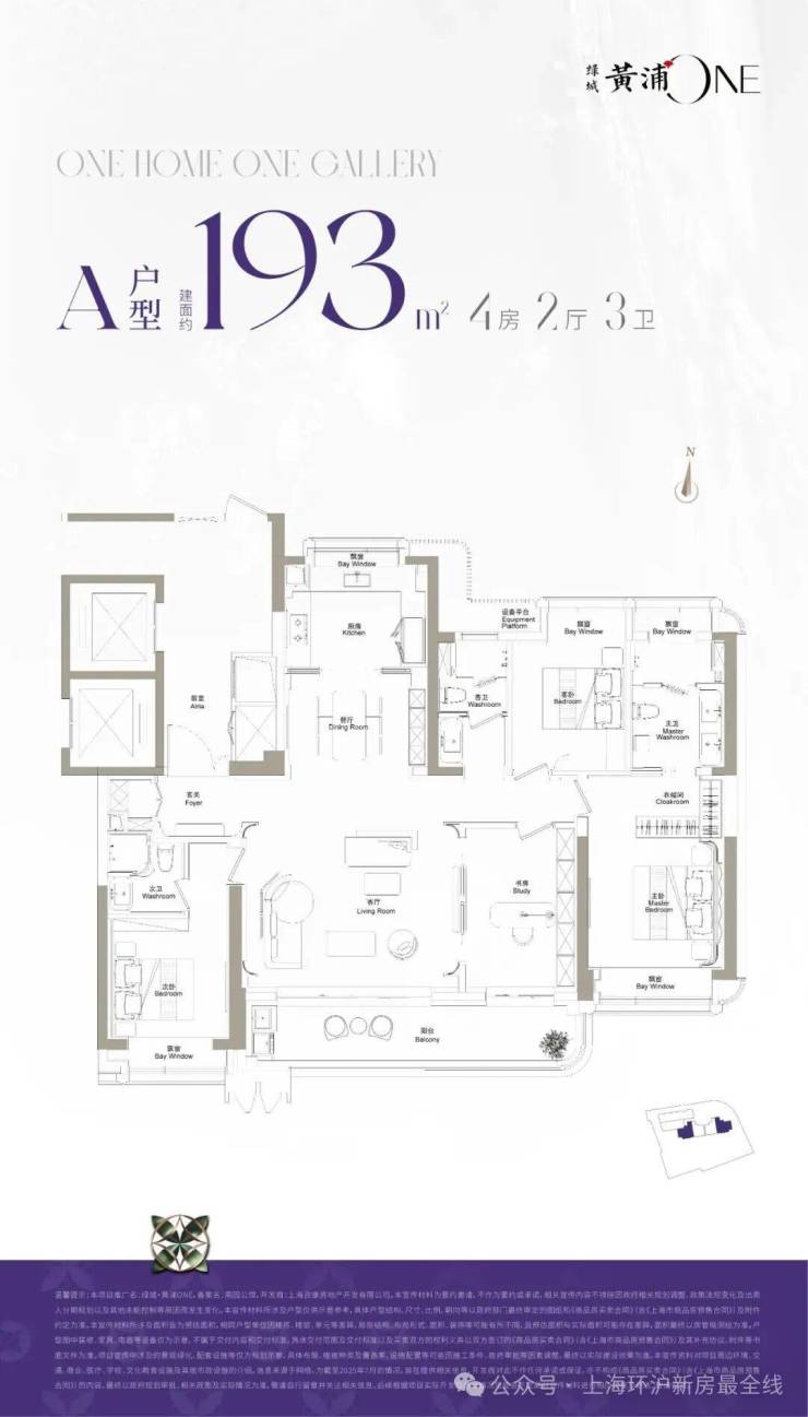 绿城·黄浦ONE规划了一幢住宅,两个户型依次排开,规整有序,边套是约193㎡4房2厅3卫,中间套是约155㎡3房2厅2卫户型,是纯粹改善大户型社区。