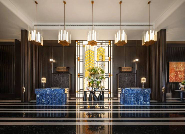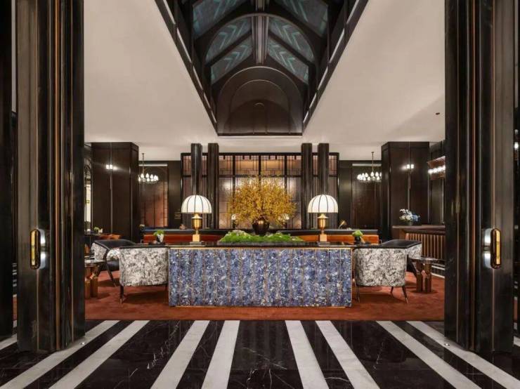 酒店式公区 :约 30 米艺术连廊,借鉴 PRADA 荣宅多立克柱式与和平饭店拱形廊道;大堂采用玻利维亚蓝、巴西乌金等奢石,海派拼花融入白玉兰元素,对标半岛酒店落客区,归家仪式感拉满。