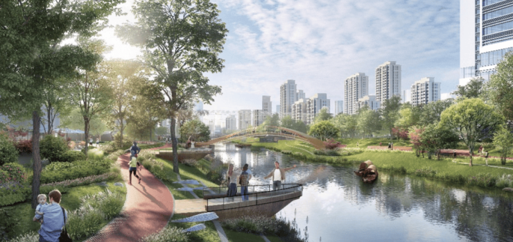 生态绿廊实景呈现 : 约 200亩“绿野谷”生态走廊一期示范段已实景呈现,绿意盎然,二期建设稳步推进,未来将与 迎虹湖 (规划中)、一字川滨河水岸(规划中)共同构建中央公园式的生态住区。