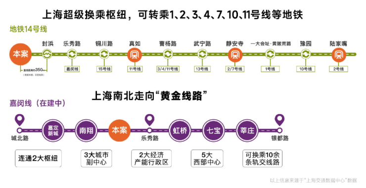 交通能级不断跃升 : 14号线和嘉闵线(在建中)双轨交汇,直线距离约350米14号线地铁口,14号线为高能级地铁线,5站普陀,直达静安,且始发有座,出行舒适;黄金走廊嘉闵线加速建设,约3站虹桥枢纽,未来可速达七宝、徐家汇、莘庄等核心区域。项目周边开泰路即将建成, 绿野谷 二期路段、骏达路、童家桥路、昌瑞路、涟澜路已启动建设,预计2026年建成。