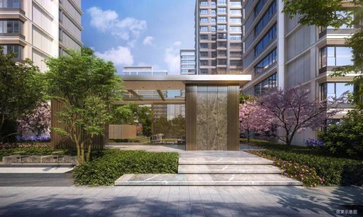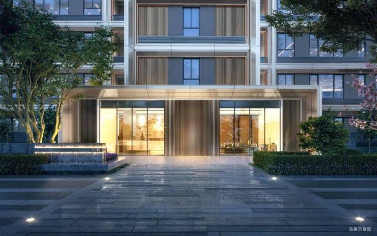 尺度大气的现代风格门头,入口展现艺术水苑、叠水瀑布以及层级绿化,彰显归家仪式感。