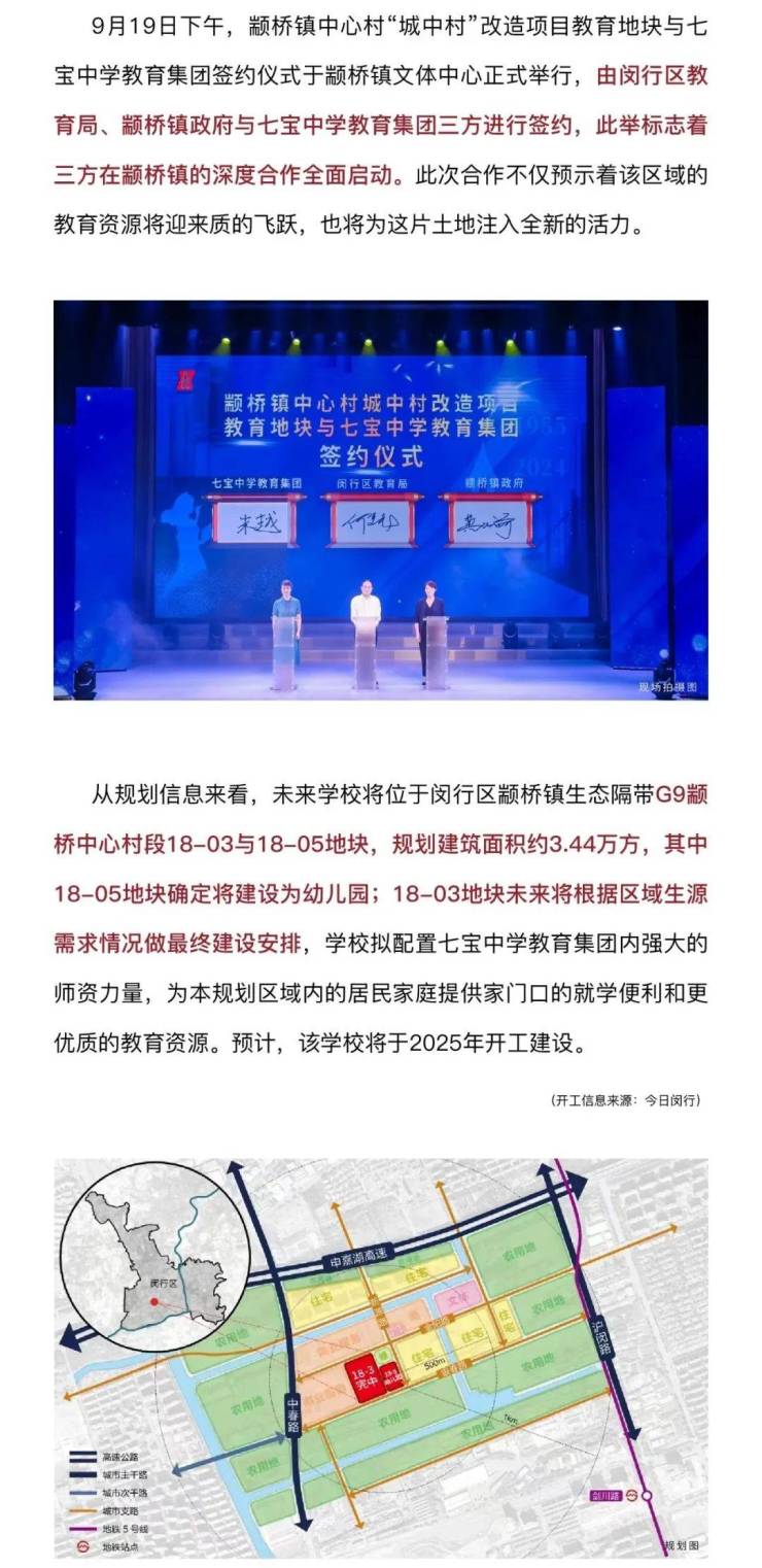 自带教育配套 :规划约 3.4 万方教育设施,含幼儿园、小学、初中,建成后将成为颛桥板块优质教育资源,实现孩子在家门口上学。