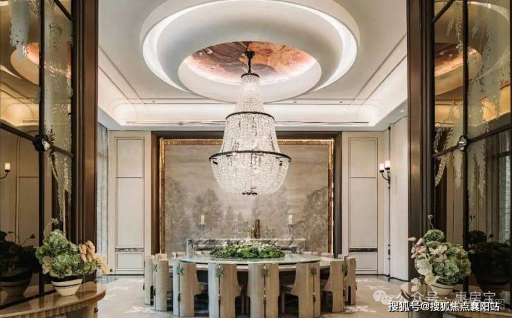 在景观落地窗环绕中,私宴厅以 花廊序列,美学对景” 构筑专属的私谧空间,巨型水晶吊灯与浅色饰面的搭配,色彩质感上相得益彰,营造融合艺术、文化与生活美学的奢享感场域,成就令人神往的优雅社交范式。