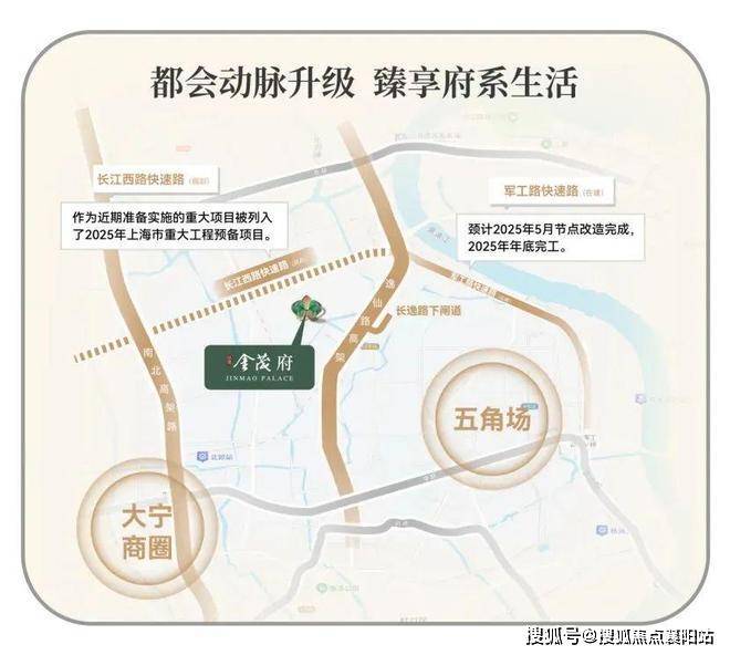 在城市交通路网方面,江湾金茂府同样优势显著。周边拥享中环高架、长江西路快速路、外环高速三横主轴,以及逸仙路高架、南北高架两纵接驳。