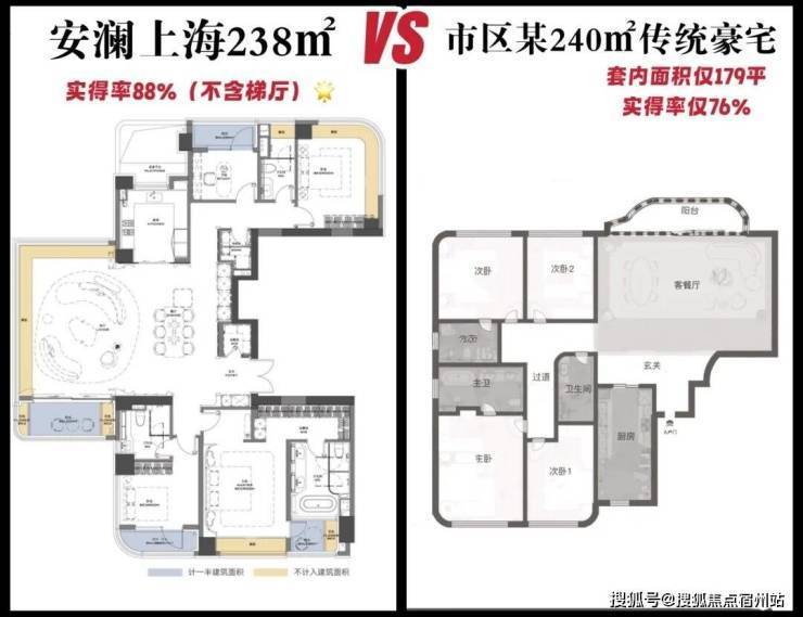 得益于新规,安澜上海238㎡套内 实得率约88%(不含梯厅) ,算上梯厅约6.8㎡,整体附加使用面积可达约31㎡。