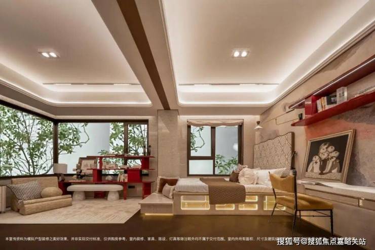 卧室的墙面是定制 3D 立体墙布,有更好的隔音效果,休息的时候帮你隔绝外界的喧嚣;微弧度设计,在心理上营造出被温柔环抱的安全感,营造出静谧的助眠氛围;飘窗也可以灵活改造多种功能。