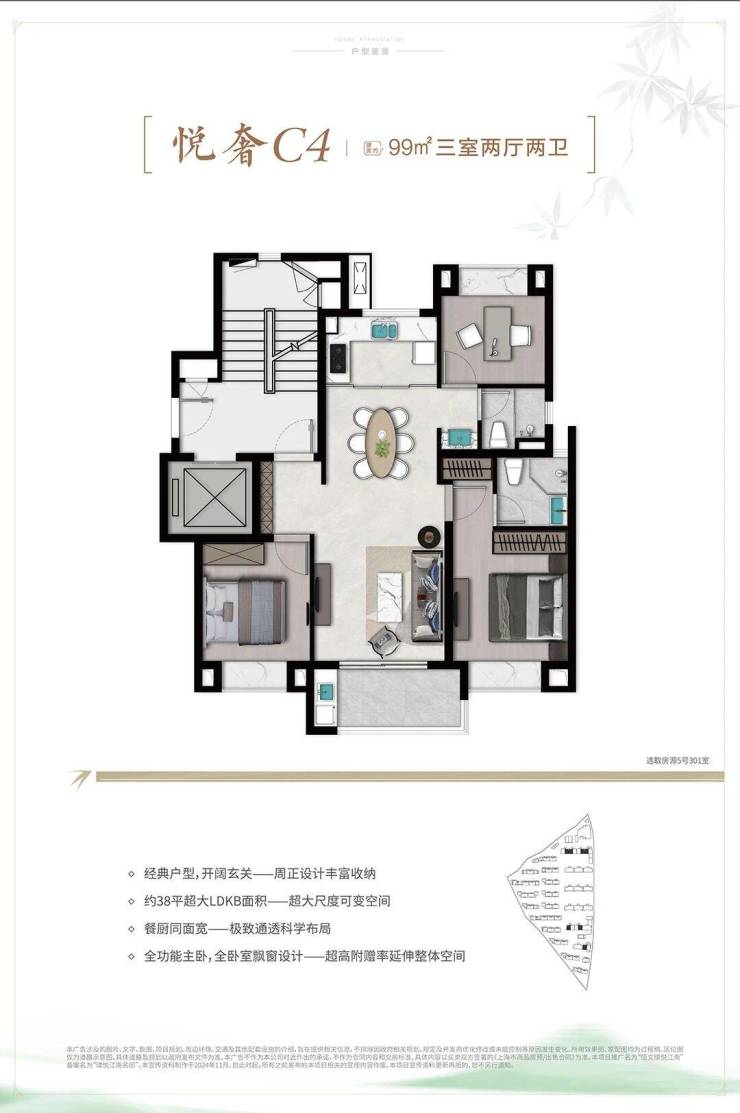 建面约135㎡四室两厅两卫,非常适合二娃家庭和三代同堂居住,兼顾实用性与舒适度,让家里的每一位成员都能拥有专属的空间,互不干扰,相处更和谐,同时还能全方位享受湖景园林的美景。户型采用四开间朝南设计,罕见的大面宽采光,让阳光洒满房间的每一个角落,南北通透的格局,让清风自由流通,居住体感达到最佳。餐客一体化的阔绰设计,空间通透开阔,衔接超大景观阳台,将社区湖景和园林美景无缝引入室内,打造沉浸式观景体验,不管是家庭日常起居,还是亲友欢聚,都能从容应对,彰显居者的身份与品味。