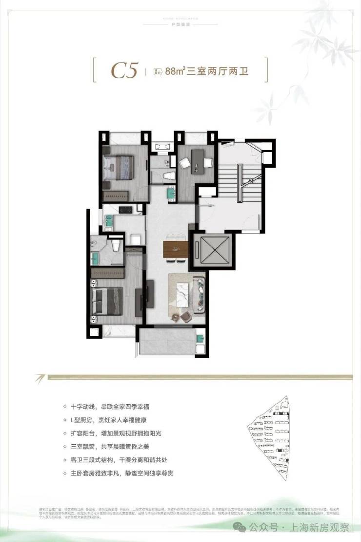 建面约115㎡三室两厅两卫,是改善型家庭的入门之选,空间宽敞、布局合理,兼顾实用性与舒适度,适合三口之家或即将迎来二娃的家庭,既能满足家庭居住需求,又能享受湖居生活的高品质体验。户型采用三开间朝南设计,大面宽采光,南北通透的格局,让阳光和清风自由流通,居住体感非常舒适,夏天凉爽、冬天温暖。餐客一体化的阔绰设计,空间通透开阔,衔接超大景观阳台,社区湖景和园林美景能尽收眼底,不管是家庭日常起居,还是亲友欢聚,都能从容应对,彰显居者的品味与格调,招待客人也很有面子。