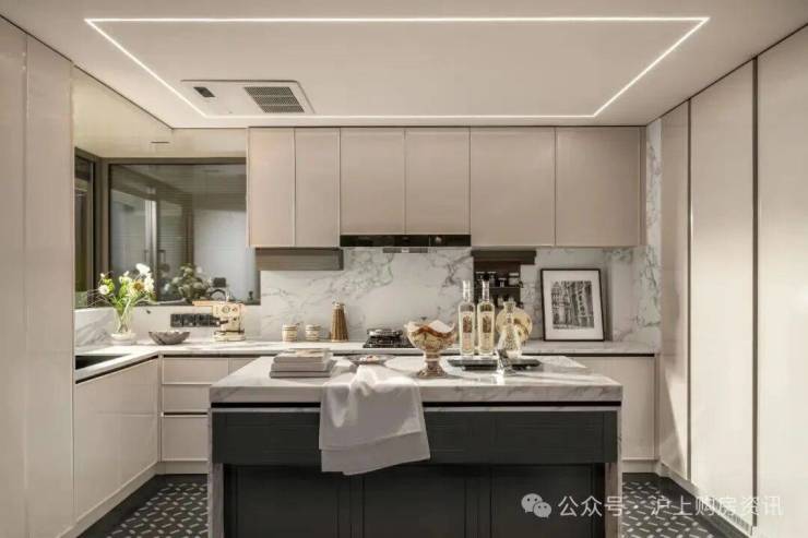 整体动静分区的格局下,U型厨房不只是烹饪场域,更因融入“社交属性”而成为家庭互动的温情角落,烹饪的同时可与客厅的家人交流。