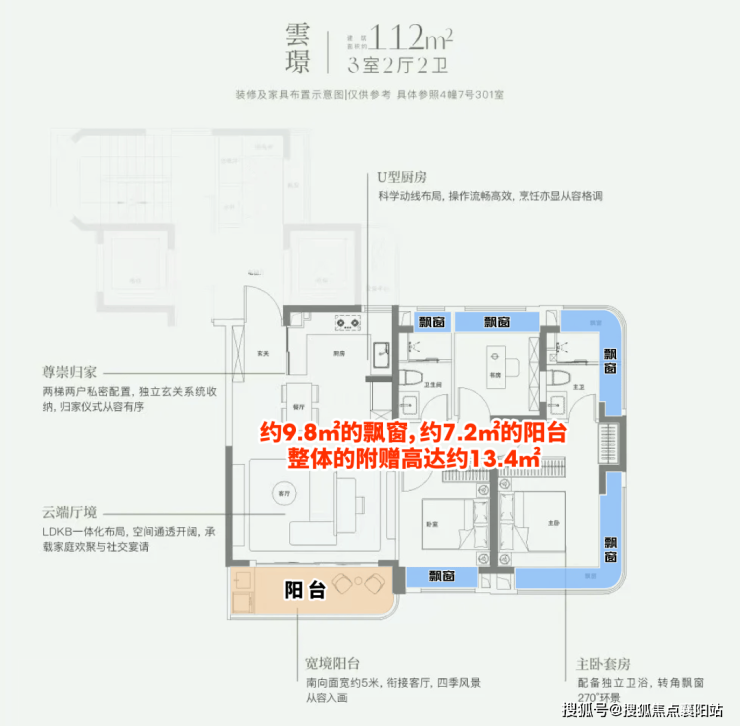 建面约 112㎡三房两厅两卫:经典三房设计,三开间朝南,南北通透,采光通风俱佳。客餐厅一体化连接南向阳台,空间开阔大气;主卧套房设计,带独立卫生间与观景飘窗,私密性与舒适度兼备;双卫生间配置,避免早高峰拥堵;全屋无浪费面积,得房率高,是三口之家或刚需改善的理想选择。