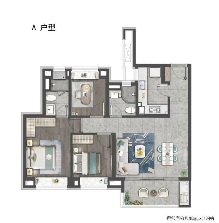 高层99㎡三房两厅两卫(中间套)样板间户型