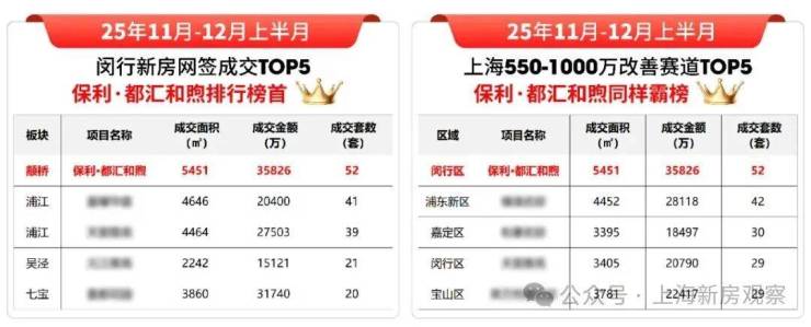 保利·都汇和煦当仁不让! 自11月开盘以来,项目不仅强势霸榜闵行区销售金额、成交面积、成交套数榜单,更在 上海550-1000万级改善赛道中脱颖而出 ,问鼎25年11-12月上半月销售三冠王,用硬核数据诠释何为“现象级热盘”。
