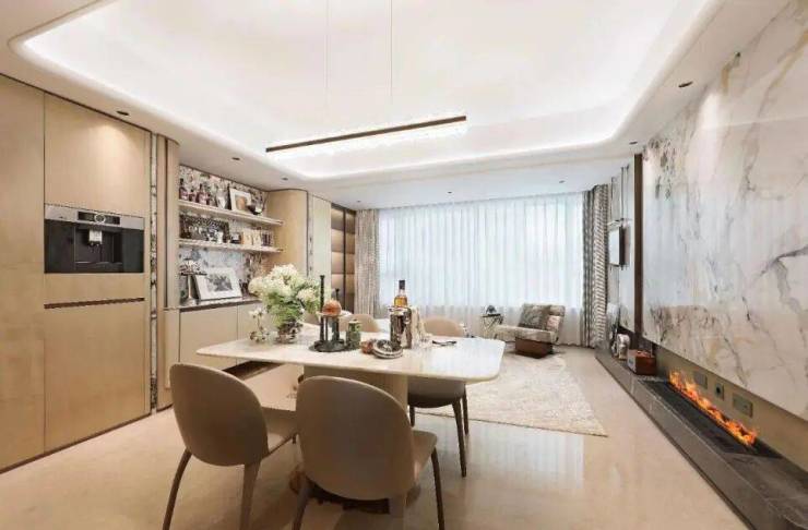室内从客餐厅地面,到主卫地面,铺设奥特曼米黄石材,色调温润,质感统一。