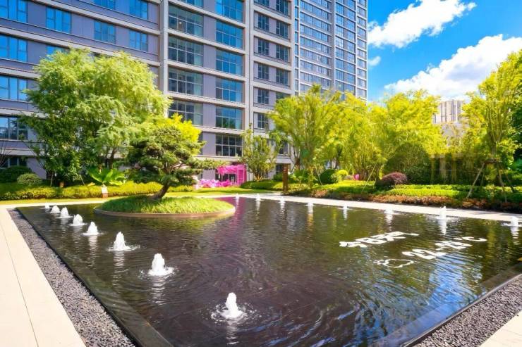 内部生态:双面滨河 + 35% 绿化率,现代简约园林,下楼即享水岸绿意