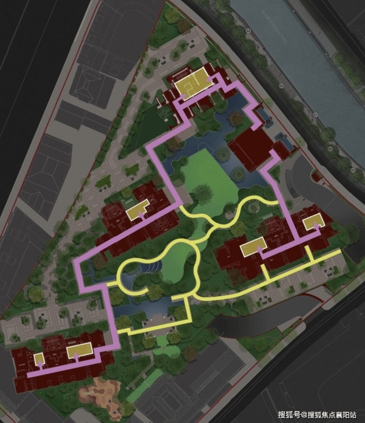 社区 约3000㎡的中心花园和6大艺术花园 ,不仅让每栋楼都享受“楼王”的待遇,且自然勾勒出一条漫游式的公园归家动线(黄色线条走向)