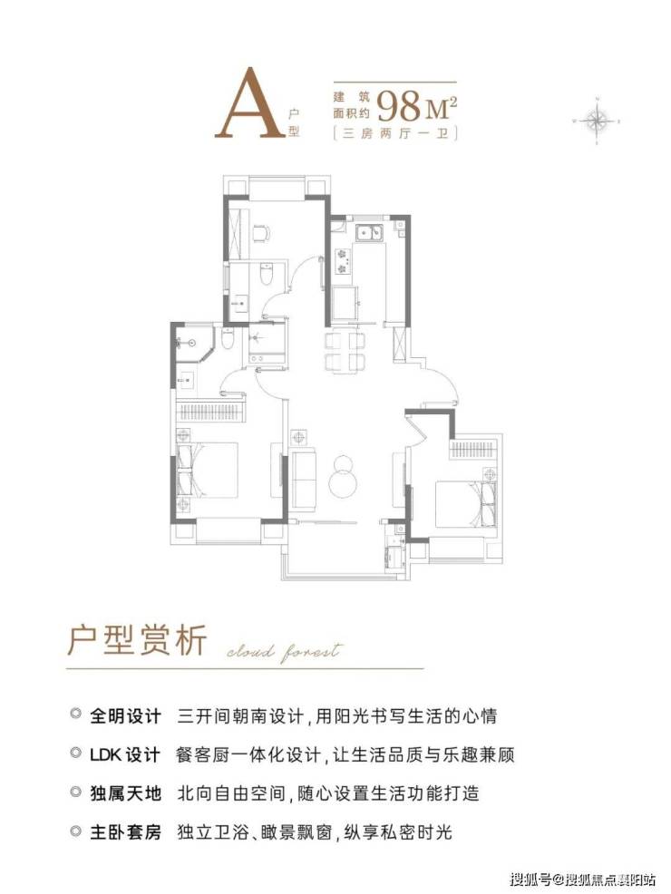 格局:三开间朝南、南北通透飞机户型,餐客一体大通厅,U 型厨房,三卧全带飘窗,主卧套房(独立卫浴);