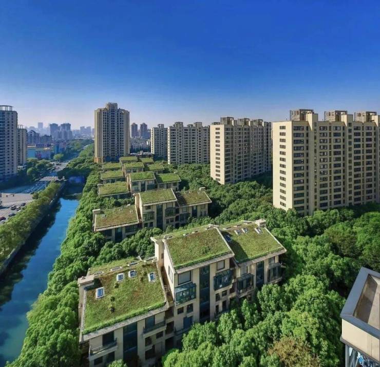 上海小区的环境,在全国来说环境都不错,上海这边的小区楼间距都比较大,小区里面绿化也不错。上海有这样一个小区,据说小区的绿化率达到了100%,绿化率100%什么概念?那就是小区里面全都是树木草坪,而且屋顶上也全是绿化,跟住在森林里面一样。网上查了一下资料,这个100%绿化率的小区,就在上海普陀万里,这个小区的一个特色就是绿化环境特别好,小区有一片12万方的森林,房子就坐落在这片森林之中,小区的名字就叫“中鹰黑森林”,号称上海曼哈顿。说小区绿化率100%,那是因为小区除了有一片森林,有些房子的楼顶上竟然也铺了草皮,有屋顶花园系统。房顶铺上草皮,虽然看起来怪怪的,但在夏天应该是能起到隔热散热的作用。小区的卖点就是环境绿化好,空气清新,还有就是高科技楼房。