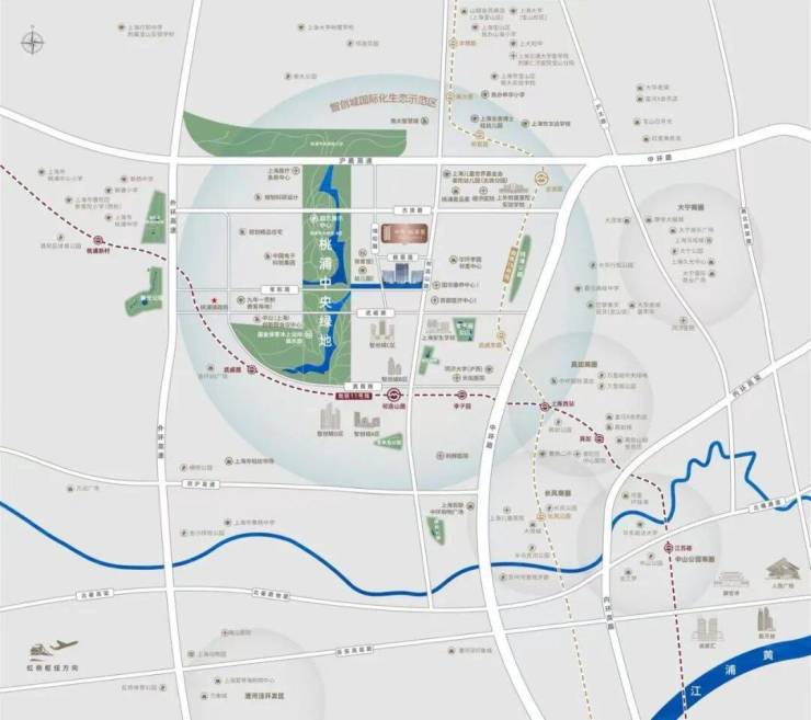桃浦中央绿地 :项目西侧紧邻约100万㎡的桃浦中央绿地(在建/部分开放),是上海中心城区最大的开放式公共绿地之一,相当于1.5个世纪公园大小。