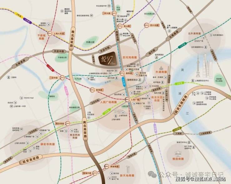 悦97坐拥苏河湾区域,约1.2km直达人民广场、 约3km范围内覆盖全市顶层城市配套:外滩、南京西路、静安寺、新天地等 ,完全满足具有全球化视野的菁英人群对国际化生活方式的多样化需求。
