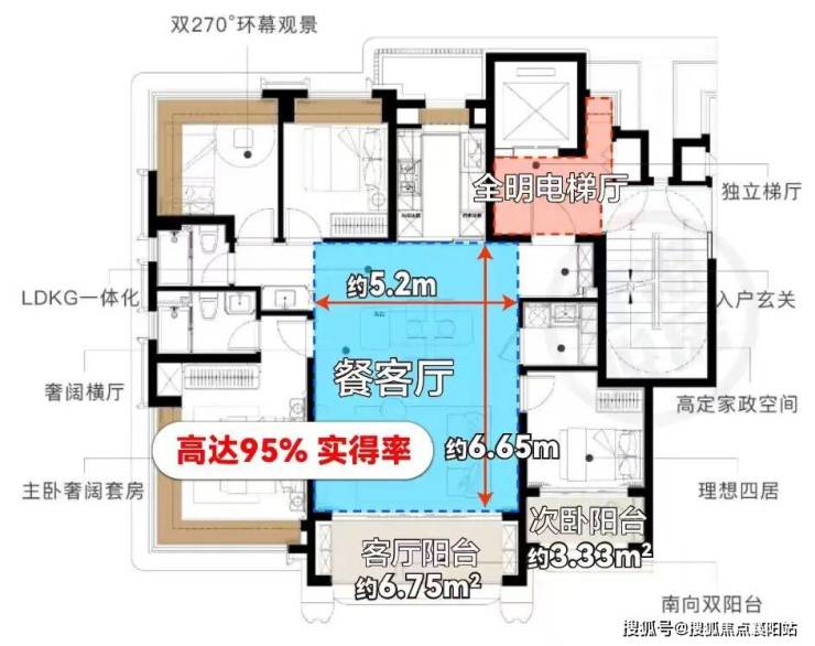 约 5.2 米开间、约 6.65米的进深的客厅,再加上高达95% 的实得率,每一组数据都在印证“老钱”的这份从容尺度。