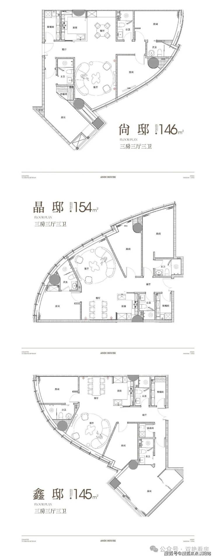 产品力是高端住宅的核心竞争力,安邸上海聚焦城市高净值人群全周期改善需求,精心打造建面约 145-272㎡3-5 房法式精装大平层,每一款户型都经过反复打磨,兼顾奢适感、实用性与采光通透性,精准适配三口之家、二胎家庭、三代同堂全阶段居住需求。所有户型均为全明通透、格局方正、多开间朝南、宽景阳台、高得房率、动静分区、LDKB 一体化设计,无冗余浪费面积,空间利用率极高,无论是日常居住、家庭聚会还是社交宴请,都能轻松满足。建面约 145-146㎡三室两厅两卫,是内环稀缺的紧凑三房,改善入门首选,总价约 950-1050 万,三开间朝南、南北通透、全明无暗角,约 11 米超大面宽,采光通风一流,客厅连通宽景阳台,引城芯美景入室,主卧套房设计,带独立卫浴与观景飘窗,私密性强,明厨明卫,干湿分离,入户玄关收纳充足,空间利用率拉满,是城市精英、改善家庭入主内环核心的最佳选择。建面约 154-161㎡3+1 房两厅两卫,双套房设计,空间灵活多变,可根据家庭需求改造为书房、儿童房、储物间等,四开间朝南,阔绰横厅,采光面更大,视野更开阔,兼顾居住舒适度与空间实用性,适合二胎家庭或三代同堂居住。建面约 166㎡四室两厅两卫,四开间朝南,超大横厅设计,南北通透,全明格局,主卧套房带独立卫浴、衣帽间与观景飘窗,私密性与舒适度兼具,中西双厨设计,满足不同烹饪习惯,多功能储物空间充足,收纳无忧,是主流改善家庭的理想选择。建面约 271-272㎡五室两厅三卫楼王户型,超大平层,三面采光,终极改善首选,空间奢阔大气,功能分区明确,独立书房、奢华主卧套房、双儿童房、多功能休闲区一应俱全,超大客厅可容纳数十人举办私宴,宽景阳台尽揽苏河与城芯美景,每一处空间都彰显顶奢格局,匹配塔尖人群的终极居住需求。