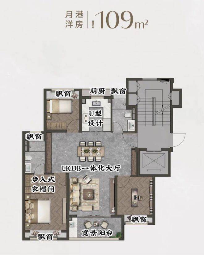 这套户型依旧拥有超高的实得率,6飘窗+1阳台的设计,且无纯走道空间,使得整个户型的可使用面积大大增加。