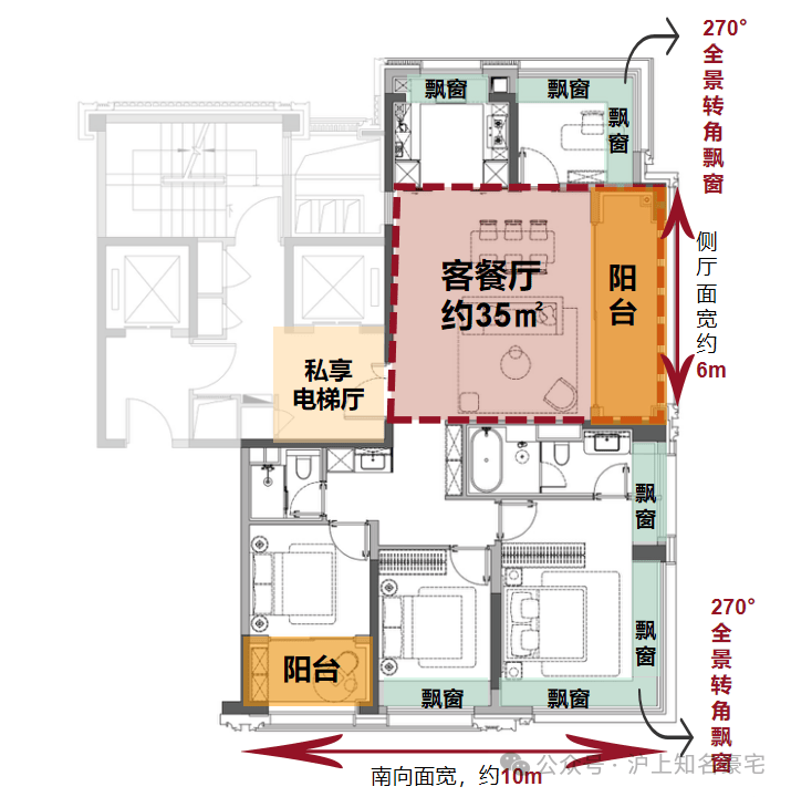 户型设计全屋飘窗与大尺度阳台,采光度全面提升,空间感倍增!全屋赠送飘窗面积约12㎡(不计容)可自主改造,阳台总面积约14㎡(一半计容)搭配约7㎡的入户私厅,户型实得率超高!