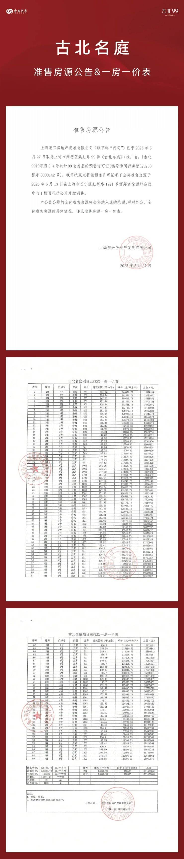 据悉, 【古北99】 加推 2号楼,合计99套房源:包括建面约135-154㎡3-4房,建面建面约230-299㎡复式房。均价约为11.65万元/㎡,即将入市,前期少量房源可直接认购!