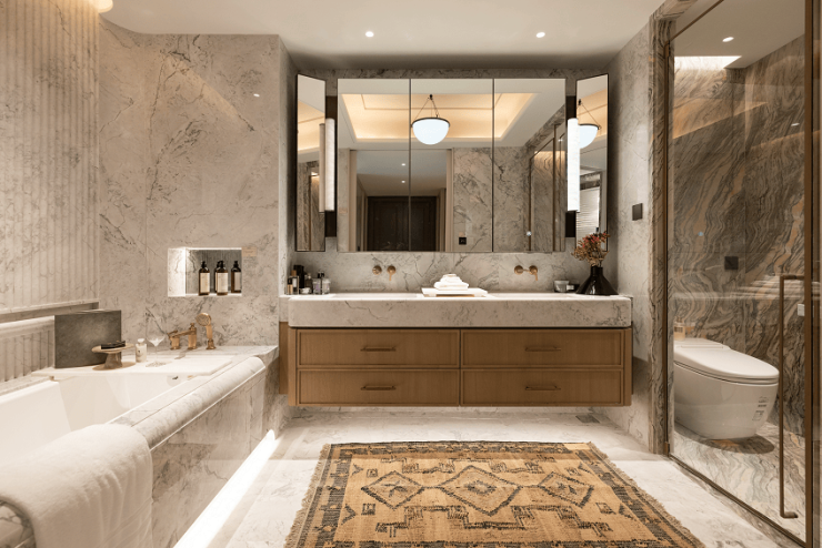 正对玄关的位置是主卫, 地面墙面为巴西鱼肚灰,淋浴间为水云纱 。 五金品牌为GESSI,浴缸及智能马桶品牌为 劳芬 ,定制镜柜里面配有美妆冰箱。