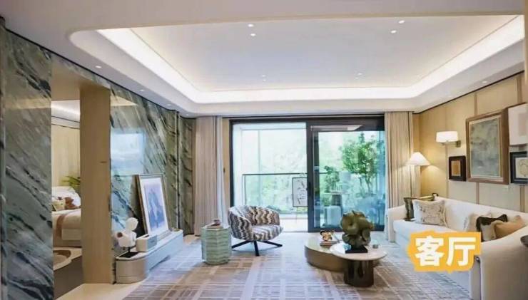 电视背景墙选用意大利超白洞石材;卫生间台面及墙面采用 芬迪白 ;来自巴西进口的静雅棕石材在有些顶豪中仅用于卫生间点缀,而在绿城黄浦ONE,则将其大量运用于地面铺装。
