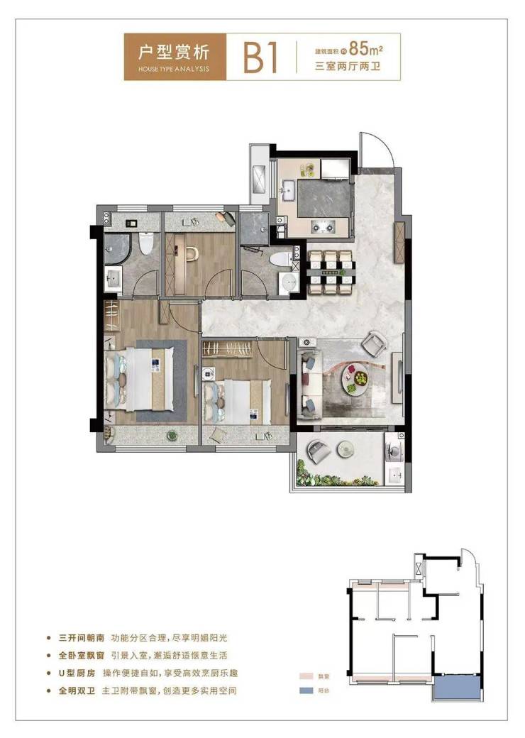 85平3房2卫, 动静分离三开间朝南,厨房U型动线,主卧自带独立卫生间和飘窗,这个户型兼具低总价和功能性。