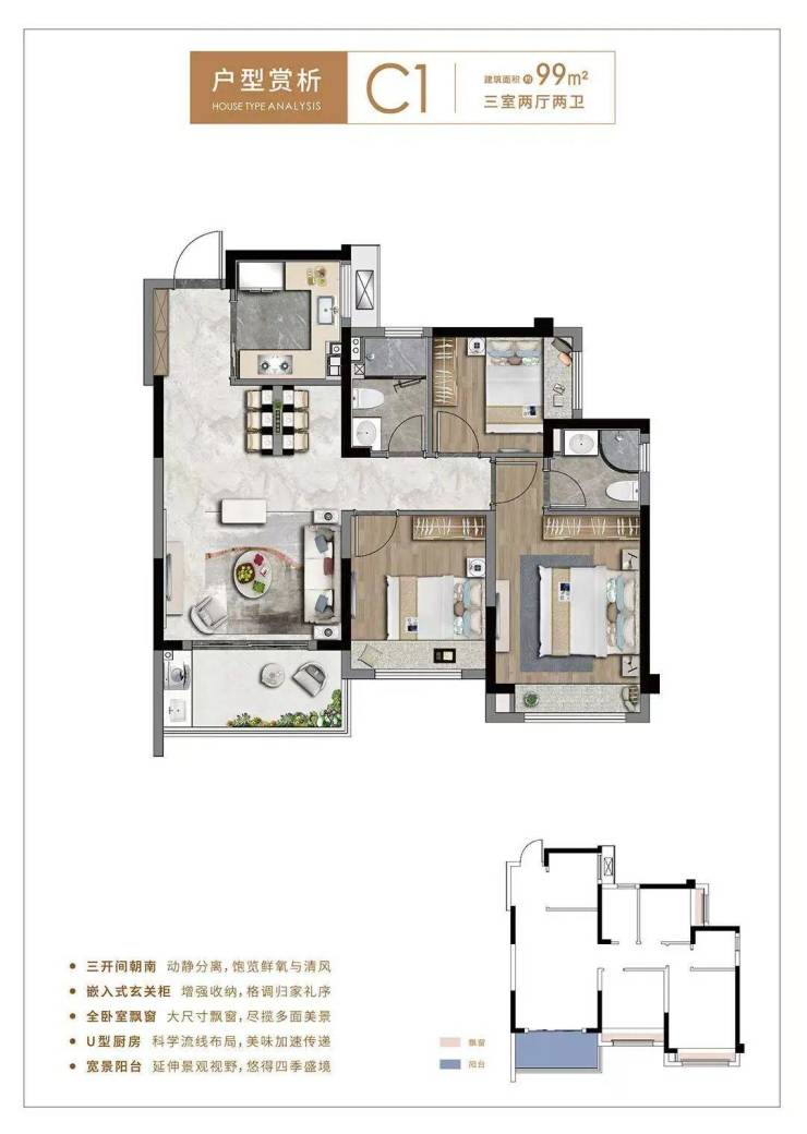 99平3房2卫, 在85平户型基础上实现空间感拓展,尤其是客厅面宽和纵深更大,更适合改善需求客户。