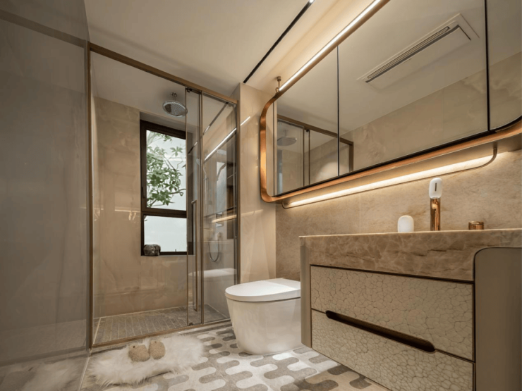 卫浴全线选用 瑞士杜拉维特洁具、德国汉斯格雅五金 ,进口大理石地面与墙面,质感拉满。主卫配备智能马桶、双台盆、大尺寸浴缸、淋浴隔断、美容舱浴霸、美妆冰箱,公卫干湿分离,防滑地砖、防水工艺,兼顾奢华与实用。