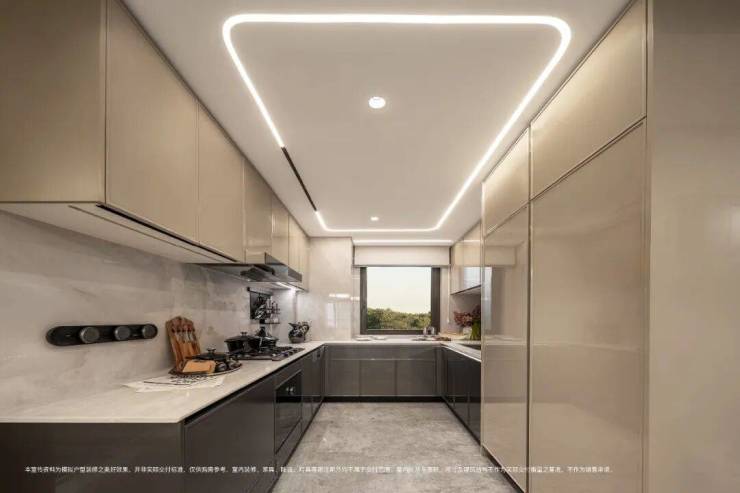 厨房采用 U 型布局,最大化操作空间,配备 嘉格纳 / 博世四件套 (油烟机、灶台、嵌入式洗碗机、蒸烤一体机),搭配铂浪高水槽、摩恩水龙头、博洛尼高端橱柜。厨房独立空调、抽拉式水龙头、大容量收纳柜、餐边柜全交付,细节尽显人性化。