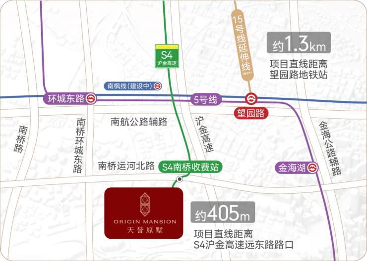 再说说地铁,项目直线距离约1.3公里就是望园路地铁站,坐地铁5号线,能直达莘庄,换乘1号线、12号线,轻松通达市区各个核心区域,对于不想开车、依赖地铁通勤的人来说,非常便捷。更值得期待的是,地铁15号线南延伸(建设中)、南枫线(建设中)也会经过这里,未来实现三轨交汇,到时候通勤效率会更高,不管是去市区,还是去奉贤其他区域,都能一键直达。