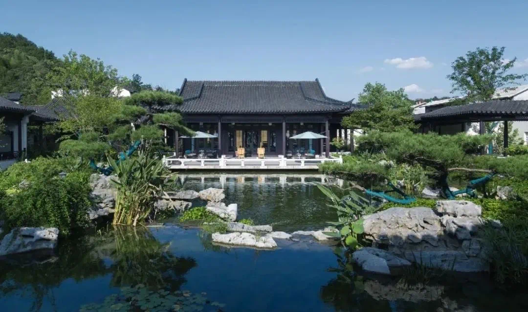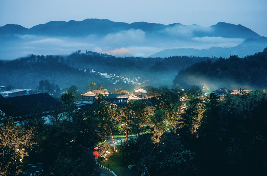 犹如陶渊明《桃花源记》中描绘的一般,忽见一条清澈的小溪,路的两侧皆是成片的桃林。车辆顺着蜿蜒的山路不知走了多远,在绕过一个山头后,眼前豁然开朗,一片白墙黛瓦的中式建筑群落融入山林草木中。