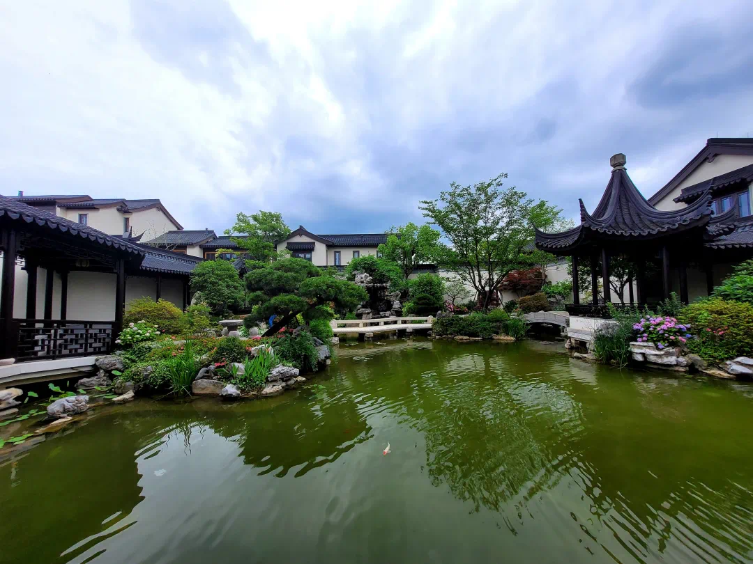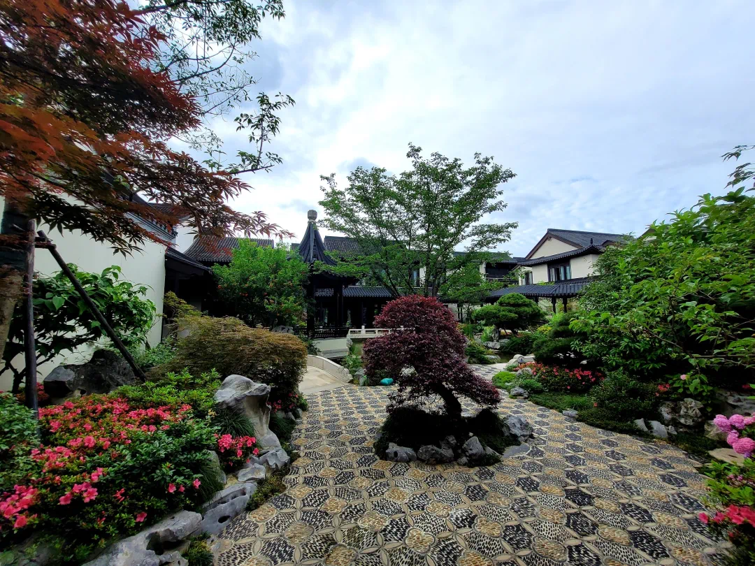 寻梦小队主要参观的是中式合院,走进园区,繁花芳草、嘉木修竹,因循了“叠石成山,栽花取势,或藏或露,或浅或深”的江南园林造景术,顿感精神爽朗,给人一种观赏水墨山水名画的感觉。园区绿植较多,配置了罗汉松、南天竹等,还包括有150年树龄的龙爪槐。脚下的风景也极为诗情雅致,花团锦簇中有一段海棠纹花街铺地,每一颗鹅卵石都是由香山帮匠人精心挑选的,每一寸铺砖里都流淌着千年技艺。