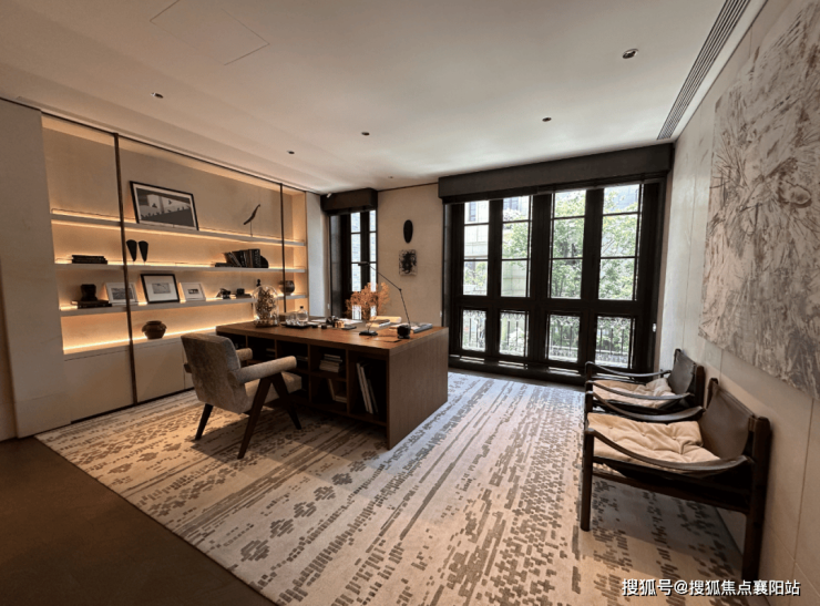 整体一层空间的东南方向,样板间设计为了茶室,配合西向落地玻璃窗,同样正对庭院。