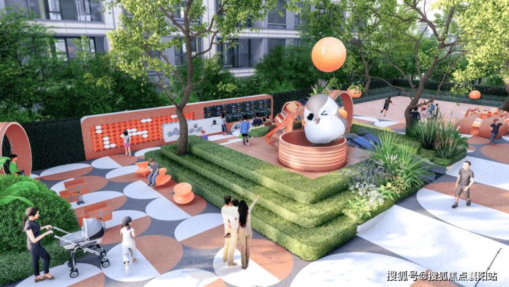 社区森系园林(35% 绿化率) :300 米中央轴、500 米跑道、阳光草坪、儿童乐园、康养花园;