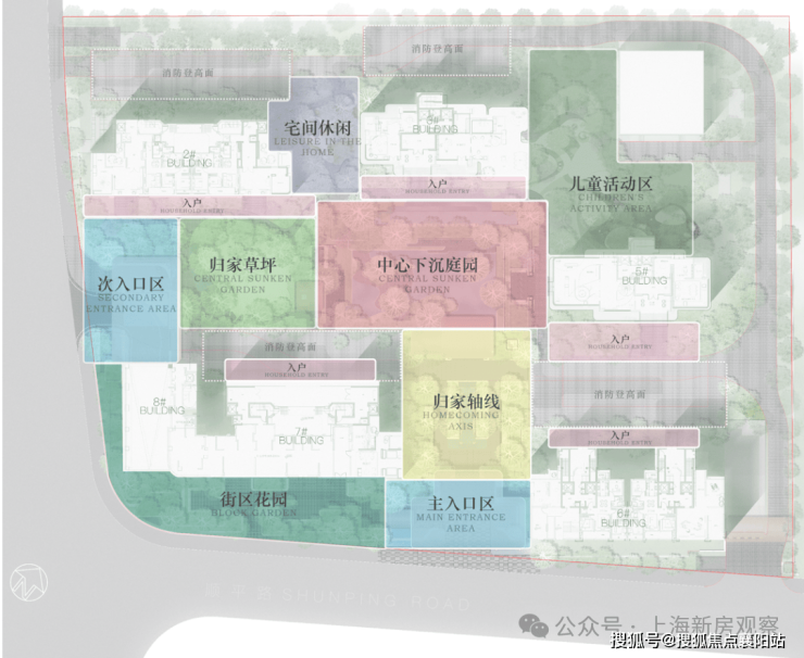 全部楼栋底层局部架空,打造多个景观架构,最大楼间距达到43米,并在小区中央位置配置下沉庭院; 6# 楼一至二层设置物业、业委会及智能快递柜等;7# 楼一层设有社区卫生服务点;社区内部有下沉式庭院、景观架构等。